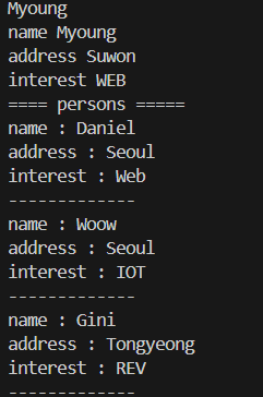 person = {'name':'Myoung', 'address':'Suwon', 'interest':'WEB'}