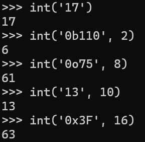 2진수, 8진수, 10진수, 16진수를 나타내는 문자열을 각각 정수로 변환할 때는 int(문자열, 진수)와 같이 2개의 인수를 전달받는다.