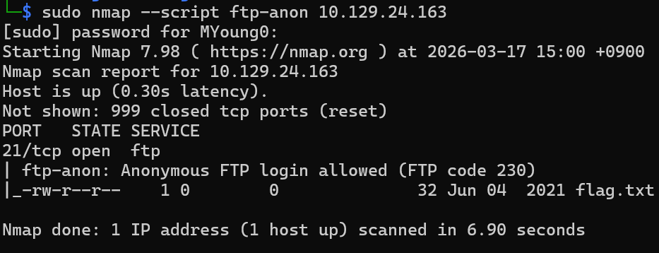 nmap 스크립트(--script ftp-anon)를 사용해서 다시 스캔해본다면, 결과에 "Anonymous FTP login allowed"라는 문구가 뜬 것을 확인할 수 있음
