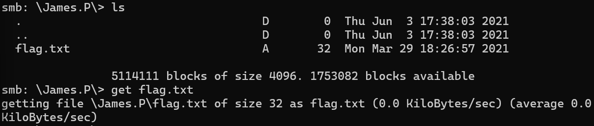 James.P에 flag파일이 존재해서 get 명령어를 통해 로컬로 가져옴