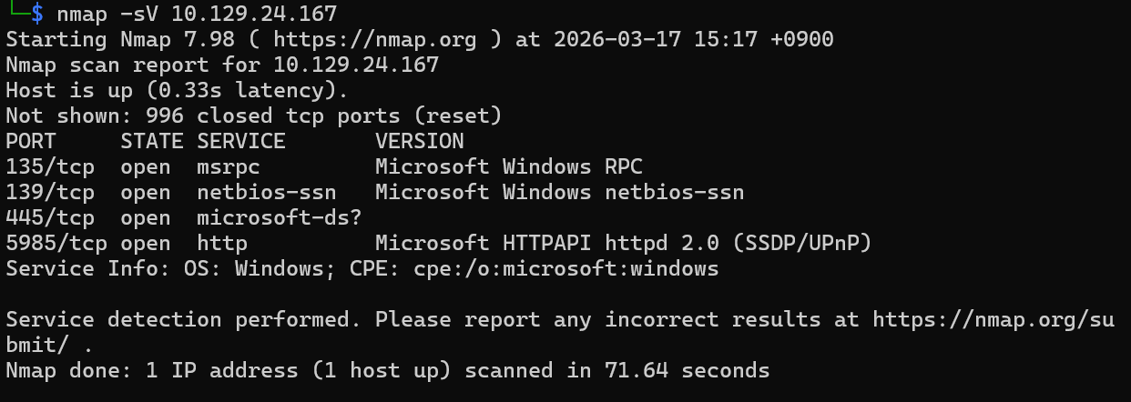 445/tcp 포트로 smb를 사용한다는 것을 확인함